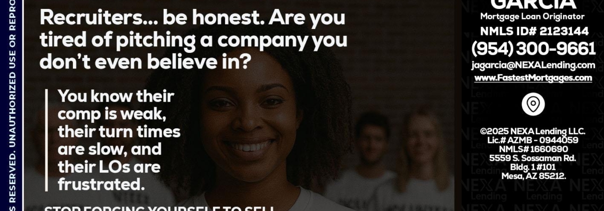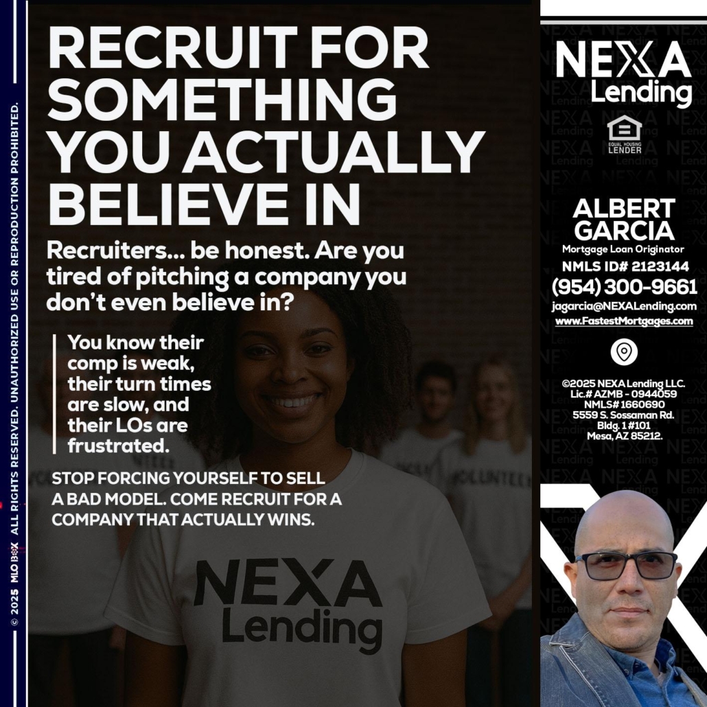 Hi, my name is Alberto Garcia. I’m a Loan Officer with NEXA Mortgage LLC., offering personalized mortgage solutions, fast customized quotes, great rates and service with integrity.