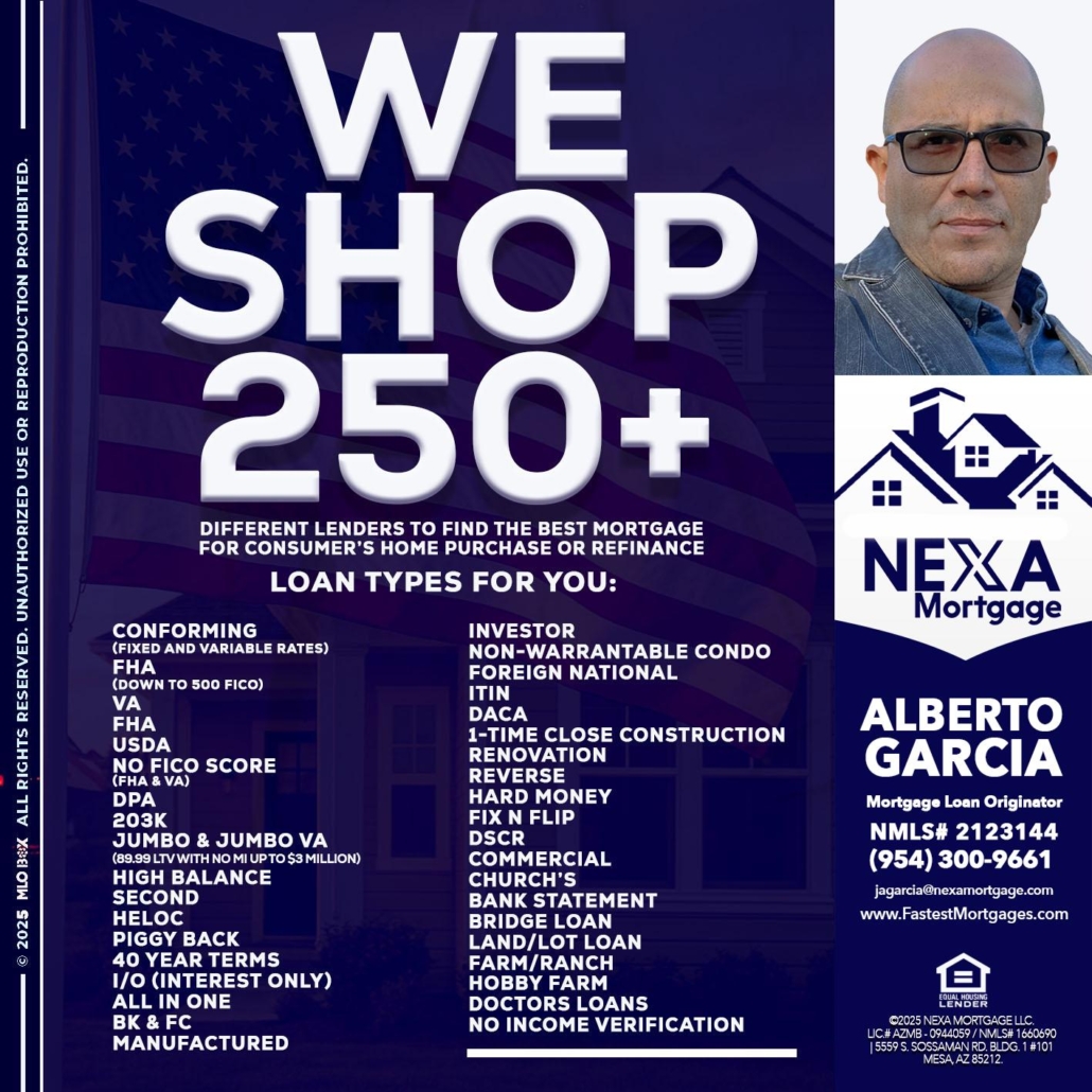 Hi, my name is Alberto Garcia. I’m a Loan Officer with NEXA Mortgage LLC., offering personalized mortgage solutions, fast customized quotes, great rates and service with integrity.