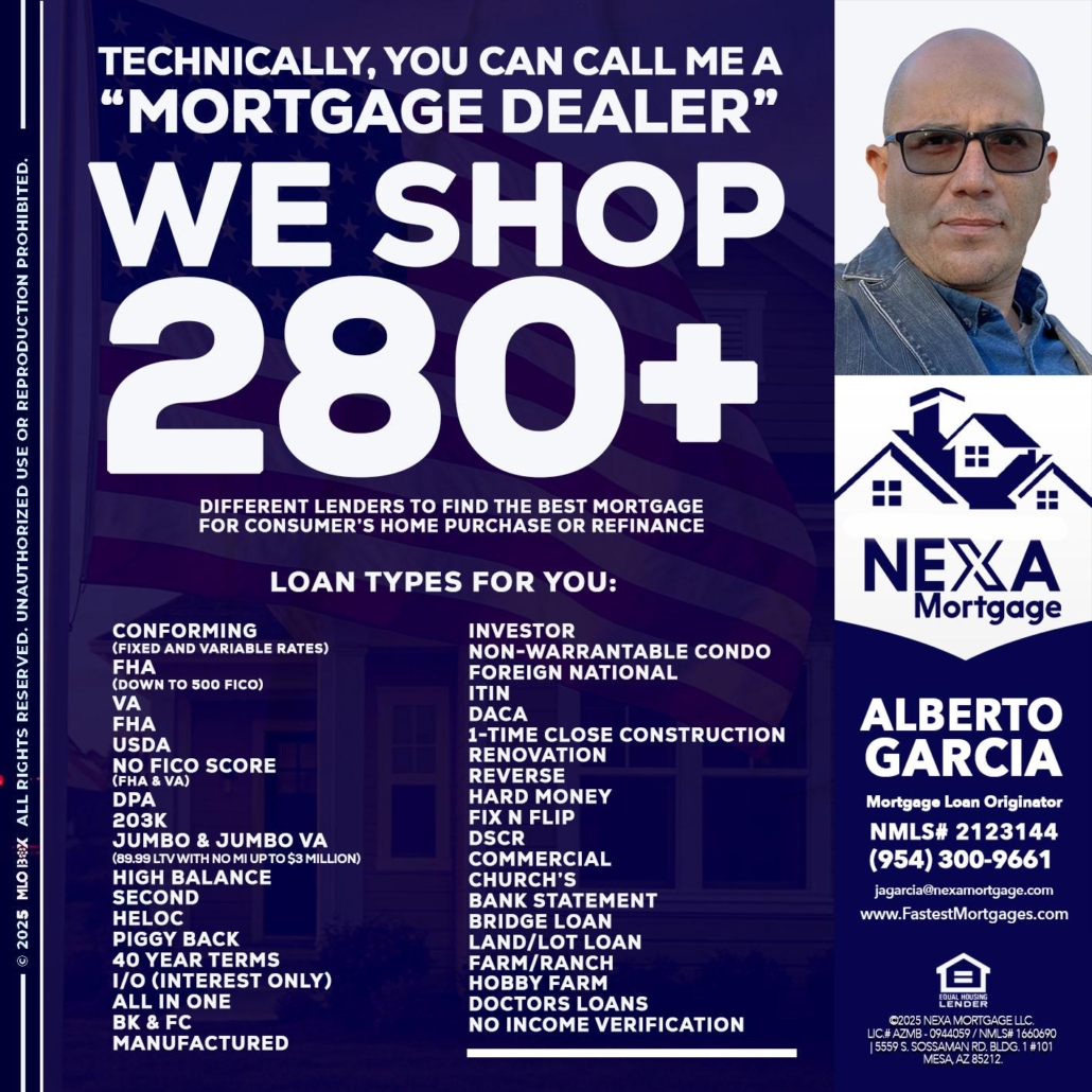 Hi, my name is Alberto Garcia. I’m a Loan Officer with NEXA Mortgage LLC., offering personalized mortgage solutions, fast customized quotes, great rates and service with integrity.
