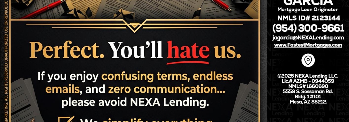 YOU WILL HATE US! - Alberto Garcia -Mortgage Loan OriginatorHi, my name is Alberto Garcia. I’m a Loan Officer with NEXA Lending LLC., offering personalized mortgage solutions, fast customized quotes, great rates and service with integrity.
